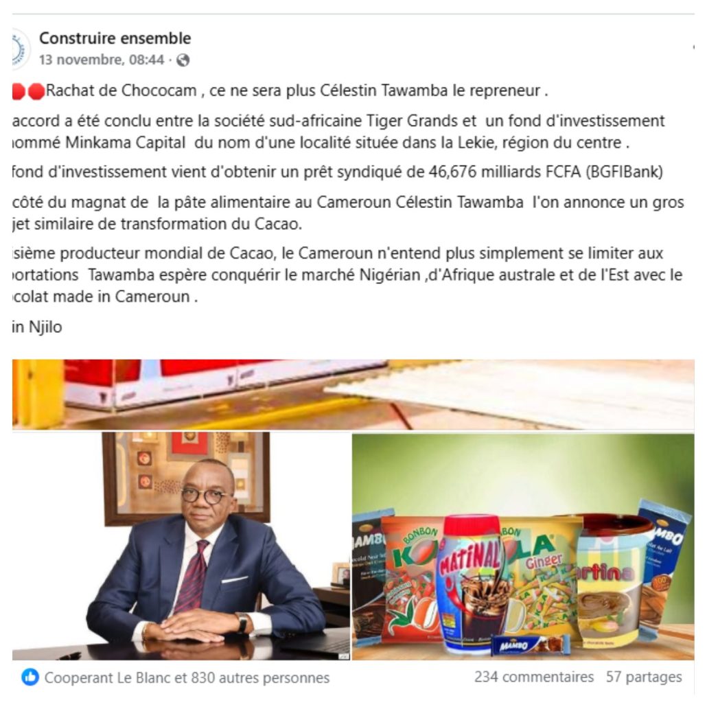 Le responsable de la page Facebook “Construire ensemble’’ a fait un post le 13 novembre 2025 où il indiquait : « (…) Troisième producteur mondial de Cacao, le Cameroun n’entend plus simplement se limiter aux importations (…) ». Ce post ne fait pas mention de l’année, encore moins de la source de ce classement. Cette publication a enregistré 234 commentaires, 831 réactions et 57 partages le 23 novembre 2025 à 12 H 50. Une interaction importante qui laisse croire que le Cameroun est le 3e producteur mondial de cacao.