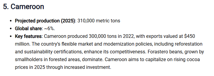 Dans cette projection, Statranker positionne encore le Cameroun à la cinquième place mondiale en 2025 avec une production projetée à 310 000 tonnes métriques.