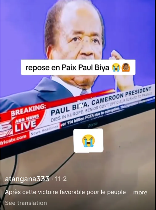 Cette publication TikTok, affirmant que le président camerounais Paul Biya est décédé, est une INTOX.